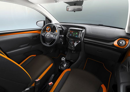 The Aygo X-Cite sports a bright orange color on its body accompanied by some black details such as the roof, the rear-view mirrors or the 15-inch alloy wheels, which come accompanied by fog lights and tinted rear windows.