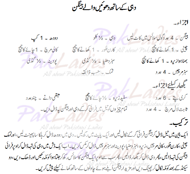 - Take a pan, add oil and fry egg plant slices. Take them out from the oil. Now mix milk, salt, sugar, corn flour, black pepper, fried cumin seeds, fresh coriander, mint and green chili, mix well. Now take a serving dish, place 1 layer of yogurt mixture then fried egg plant, then again yogurt and finally pour bighar. At the end place charcoal on a slice of egg plant and give smoke of charcoal, cover for 2 sec. Serve with boil rice.