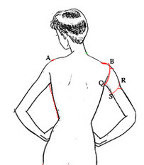 Shoulder =A-B = Measured from the prominent bone at the end of one shoulder to the prominent bone at the end of the other shoulder.